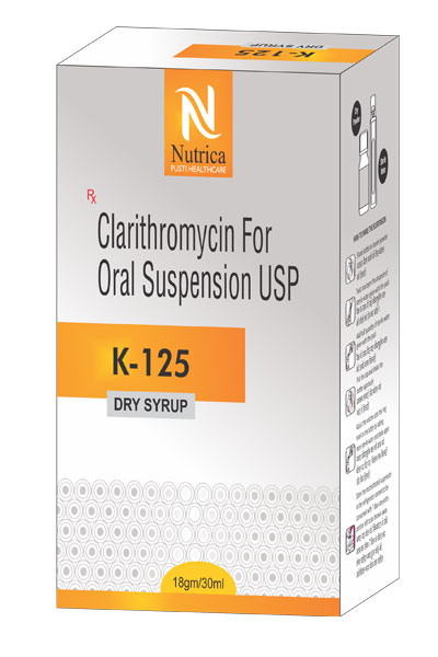 K-125 is a dry syrup formulation of clarithromycin. It is been used in paediatric patients for various infections. It is very effective and safe anti biotic for kids. Sterile water comes along with it for dissolution. It is having a delicious Orange-Mint flavour.